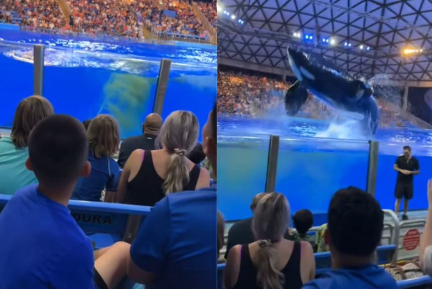 Durante uma apresentação em um parque temático, uma orca defecou e espirrou água suja na plateia; veja o vídeo