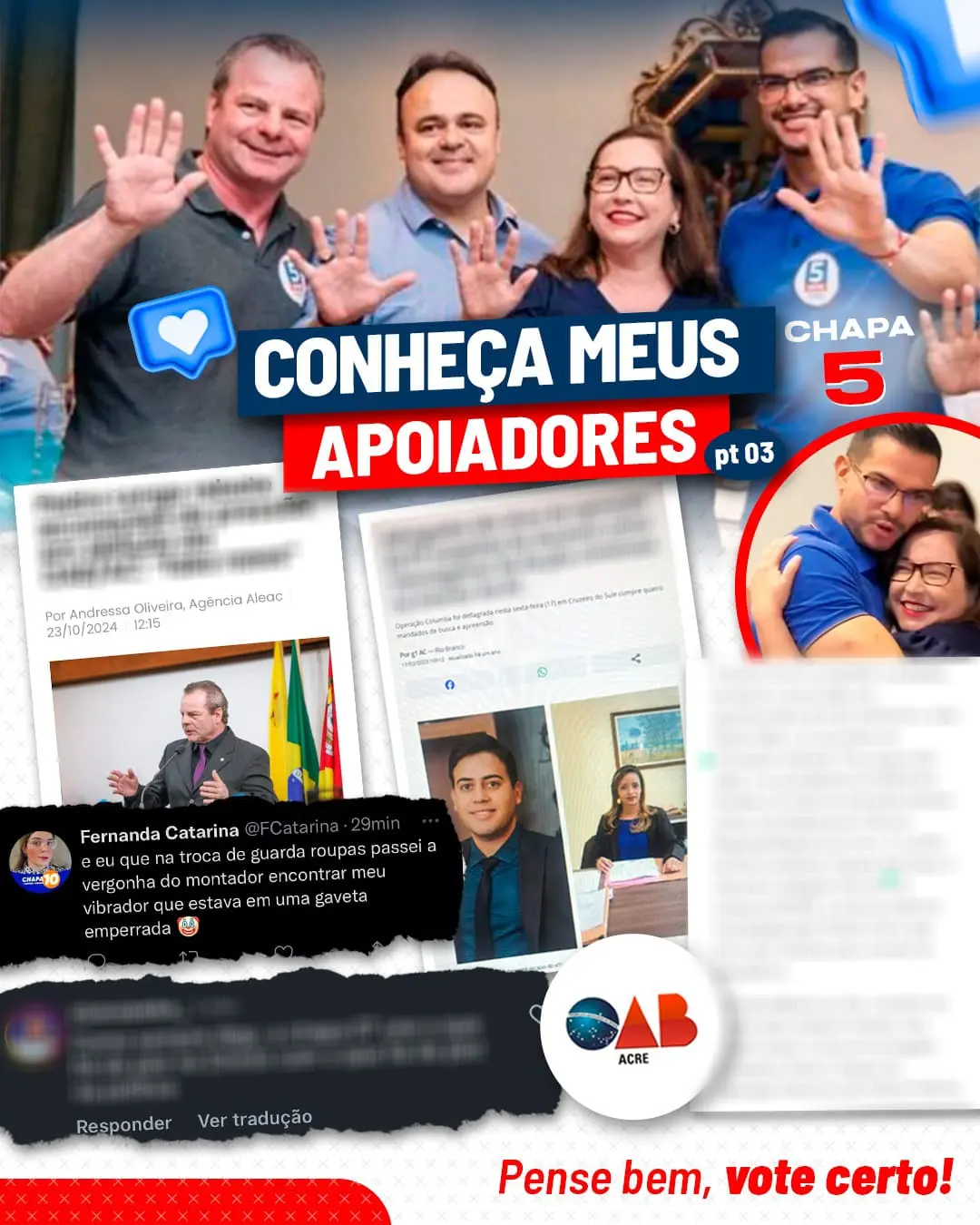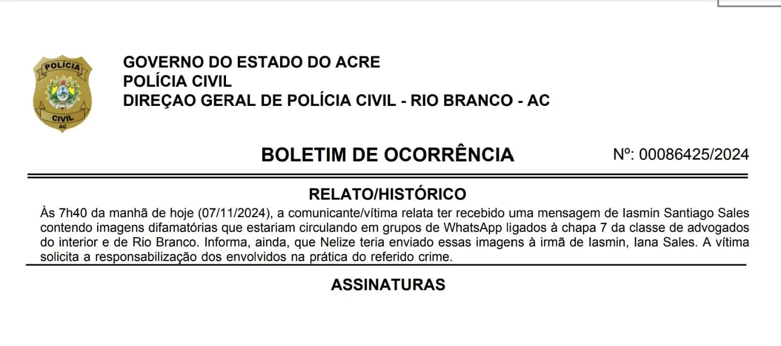 A advogada Fernanda Catarina, de Rio Branco, registrou um boletim de ocorrência nesta quinta-feira (07/11) contra apoiadores da Chapa 7, liderada por Rodrigo Aiache, após o vazamento e divulgação de uma postagem pessoal antiga em grupos de WhatsApp ligados à campanha eleitoral da classe de advogados.