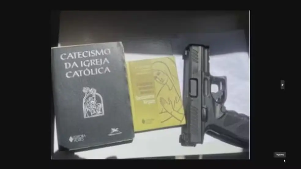 Uma foto de uma arma de fogo ao lado de dois livros religiosos acompanha a mensagem.