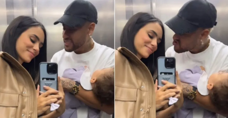 A influenciadora Bruna Biancardi, 30, publicou um boomerang no Instagram ao lado do namorado, o jogador Neymar, 32, e a filha dos dois, Mavie, 1.