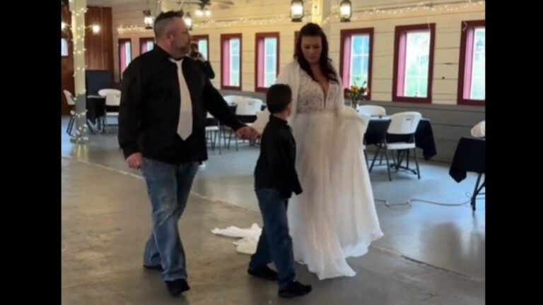 O casal, que entrou no salão com o filho, ao som de uma música de Miley Cyrus, pode ser visto tentando manter a compostura enquanto celebra com os poucos convidados que compareceram.