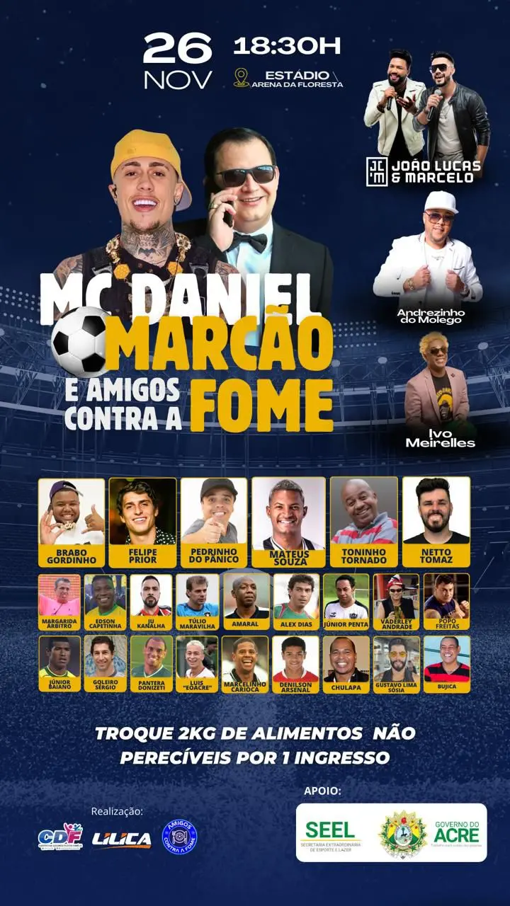 No dia 26 deste mês o MC Daniel e o empresário Marcão e os amigos contra a Fome realizam o jogo solidário no Estádio Arena da Floresta. O ingresso pode ser adquirido na troca de 2kg de alimentos não perecíveis.
