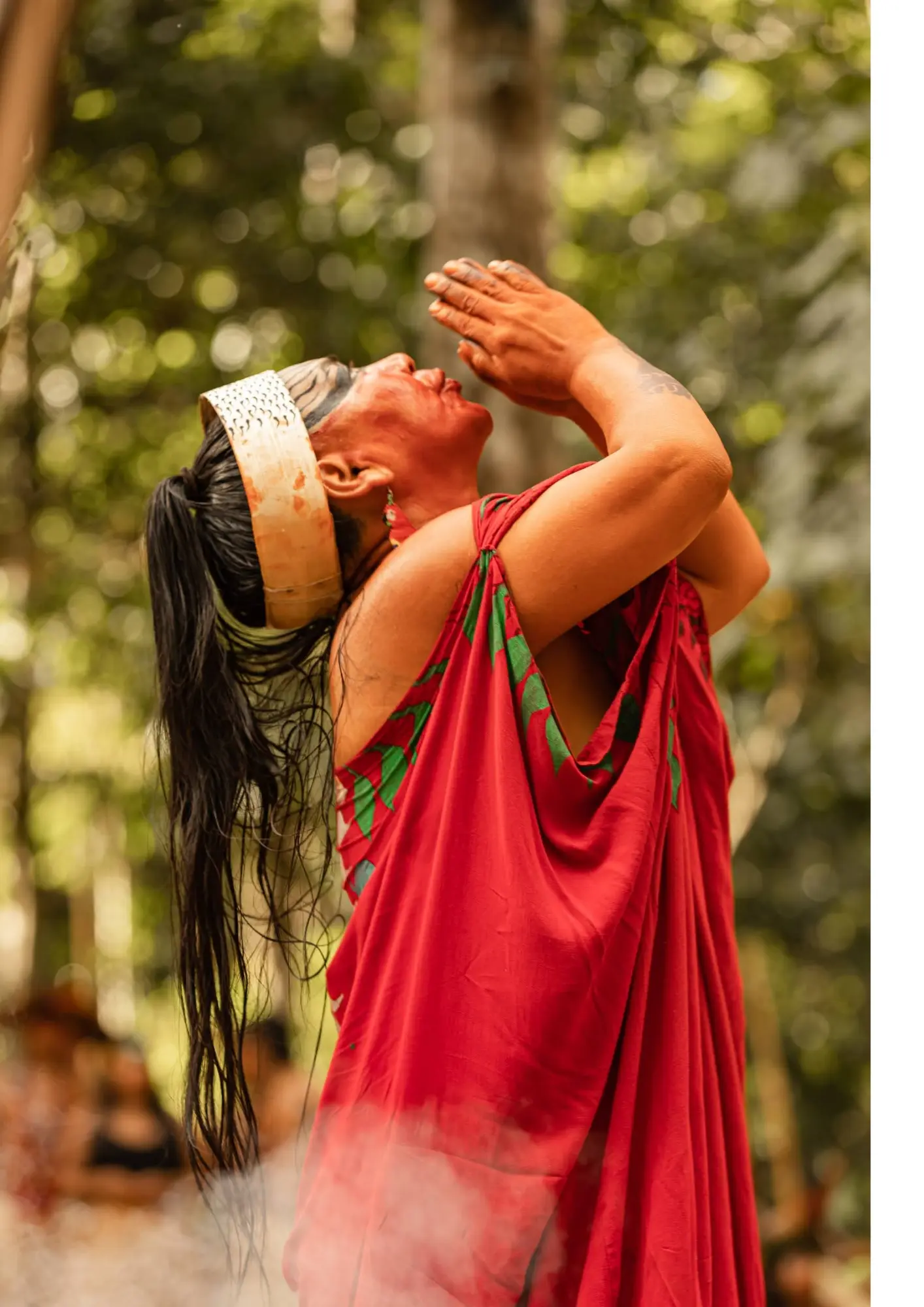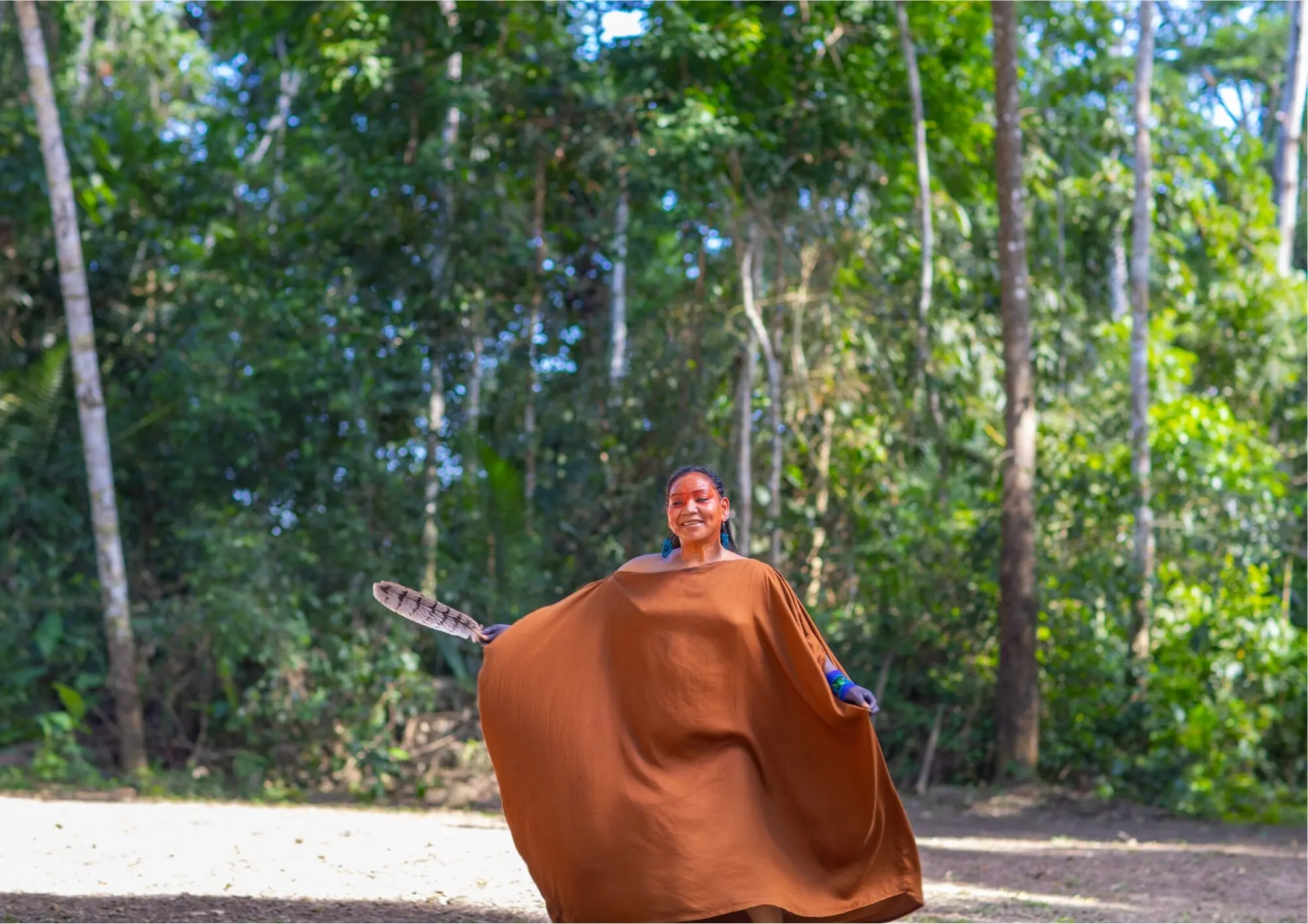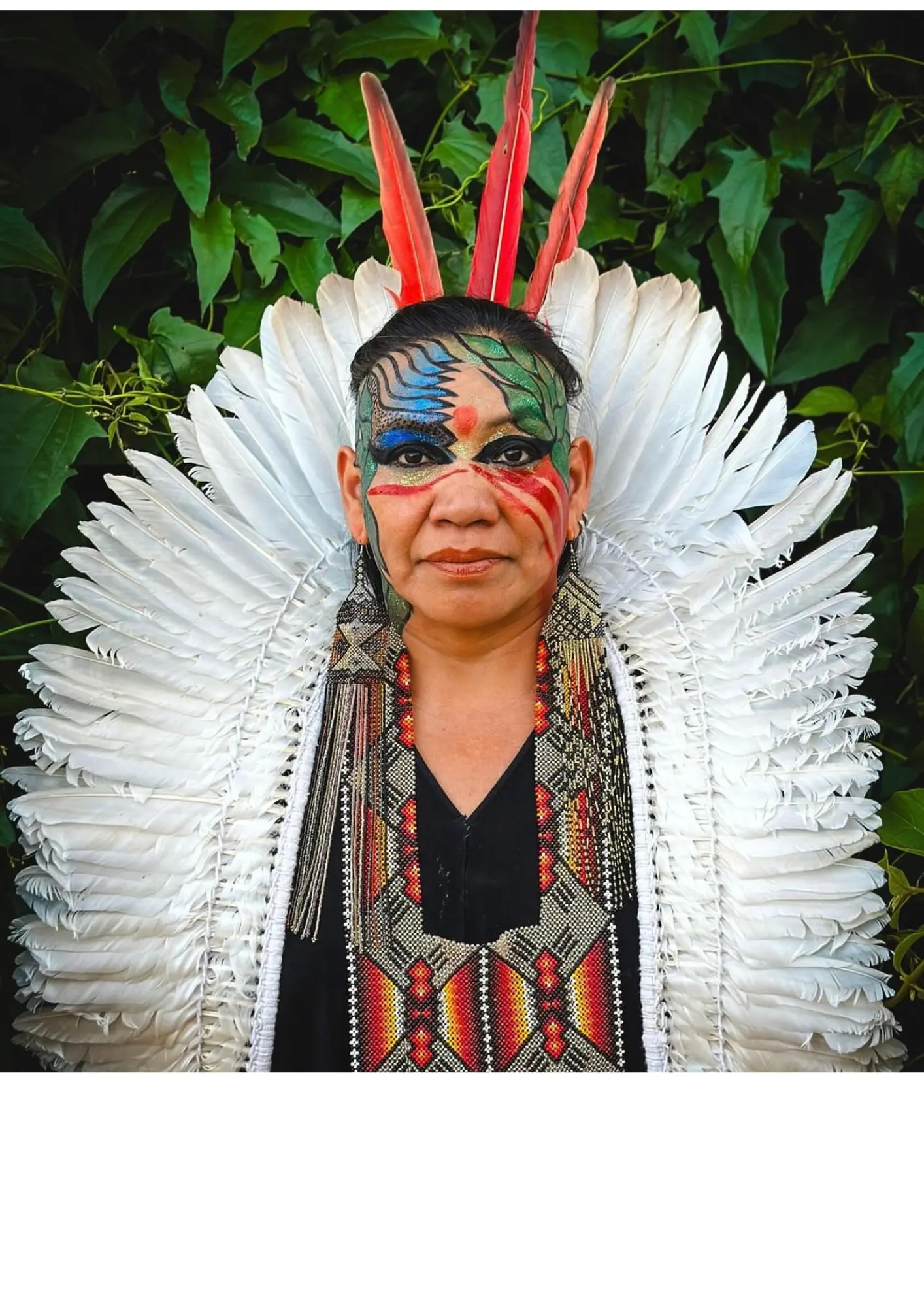 Hushahu Yawanawa, líder espiritual e guardiã da sabedoria ancestral, em plena conexão com a floresta que a inspira e a fortalece em sua jornada como pajé/Foto cedida