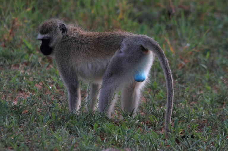 O Macaco vervet (Chlorocebus pygerythrus) é um primata nativo da África com a característica diferente. Na natureza, é comum encontrarmos machos com traços marcantes para atrair as fêmeas na época de acasalamento. Nesta espécie, os macacos possuem os testículos azuis, em contraste com o órgão reprodutor vermelho.