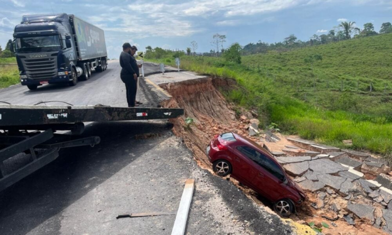 Cratera ‘engole’ carros em trecho da BR-364 e causa acidentes graves por falta de sinalização