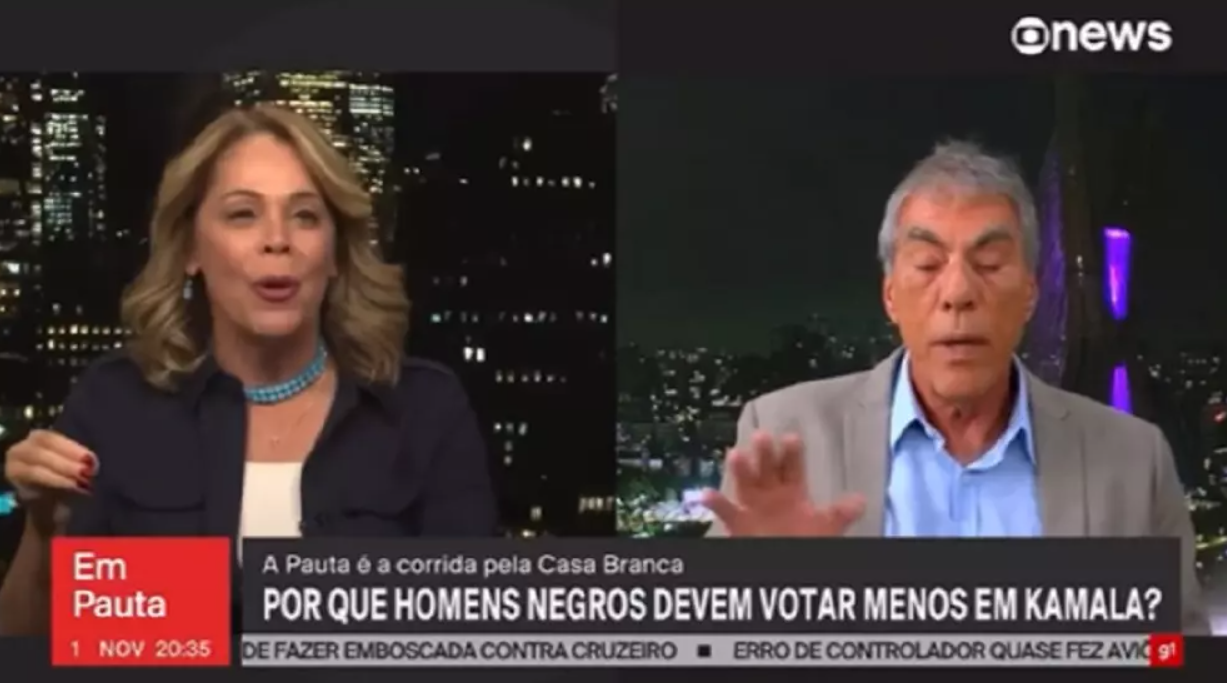 A discussão entre eles começou quando a atração da GloboNews abordava o comportamento dos homens na eleição norte-americana, disputada por Kamala Harris e Donald Trump. “Eu tenho lugar de fala, o caminho para as mulheres é mais difícil”, opinou a colunista, sendo interrompida pelo colega de emissora.