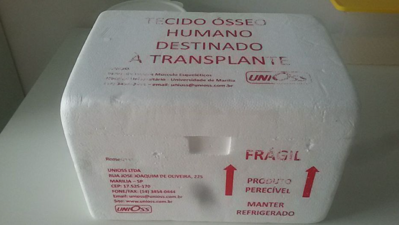 Imagem da caixa contendo o tecido ósseo humano destinado ao transplante. O procedimento exige credenciamento especializado para garantir a segurança e a eficácia do tratamento/Foto cedida