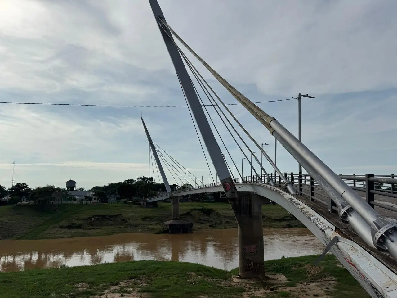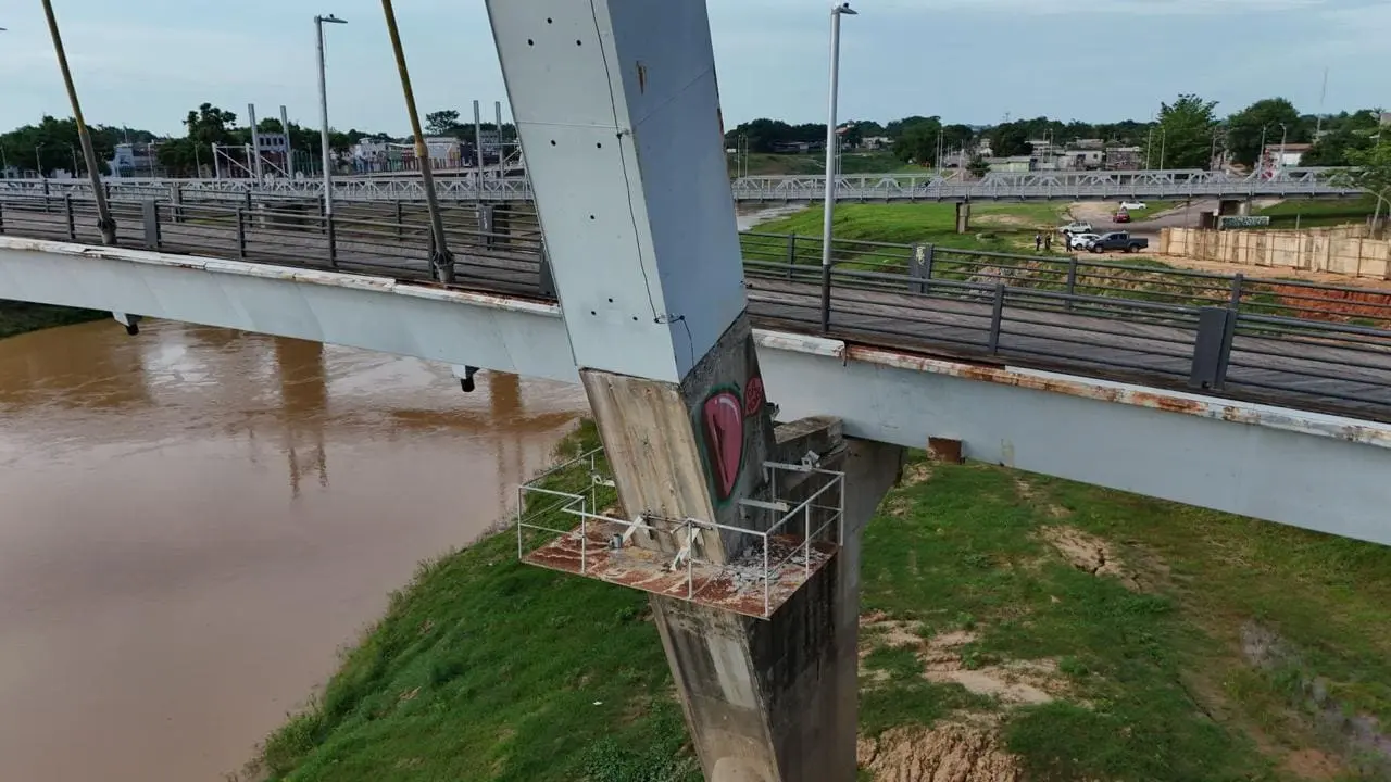 A coluna de metal que fica em cima de uma das bases da ponte está entortando na direção do rio. Além disso, é possível ver parte do concreto de sustentação se esfarelando.