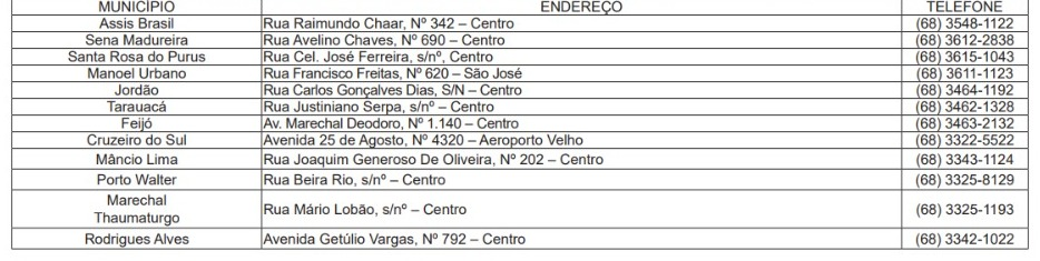 Os documentos dos candidatos chamados deverão ser entregues no local indicado na tabela abaixo para cada município.