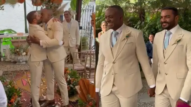 Vestindo trajes em tons claros, com gravatas azuis, camisas brancas e sapatos marrons, o casal encantou os convidados enquanto caminhava em direção ao altar. Rizo, visivelmente emocionado, distribuiu beijos e sorrisos para os amigos, que acompanhavam o momento especial.