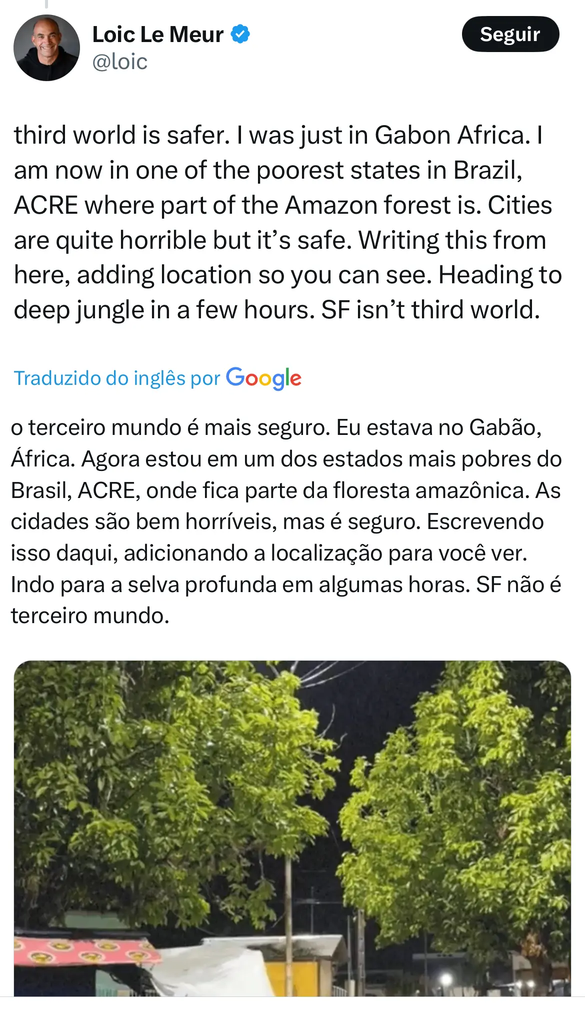 “O terceiro mundo é mais seguro. Eu estava no Gabão, África. Agora estou em um dos estados mais pobres do Brasil, ACRE, onde fica parte da floresta amazônica. As cidades são bem horríveis, mas é seguro. Escrevendo isso daqui, adicionando a localização para você ver. Indo para a selva profunda em algumas horas. SF [San Francisco] não é terceiro mundo”.