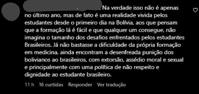 “Já não bastasse a dificuldade da própria formação em medicina, ainda encontram a desenfreada punição dos bolivianos ao brasileiros, com extorsão, assédio moral e sexual e principalmente com uma política de não respeito e dignidade ao estudante brasileiro”, diz um dos comentários.