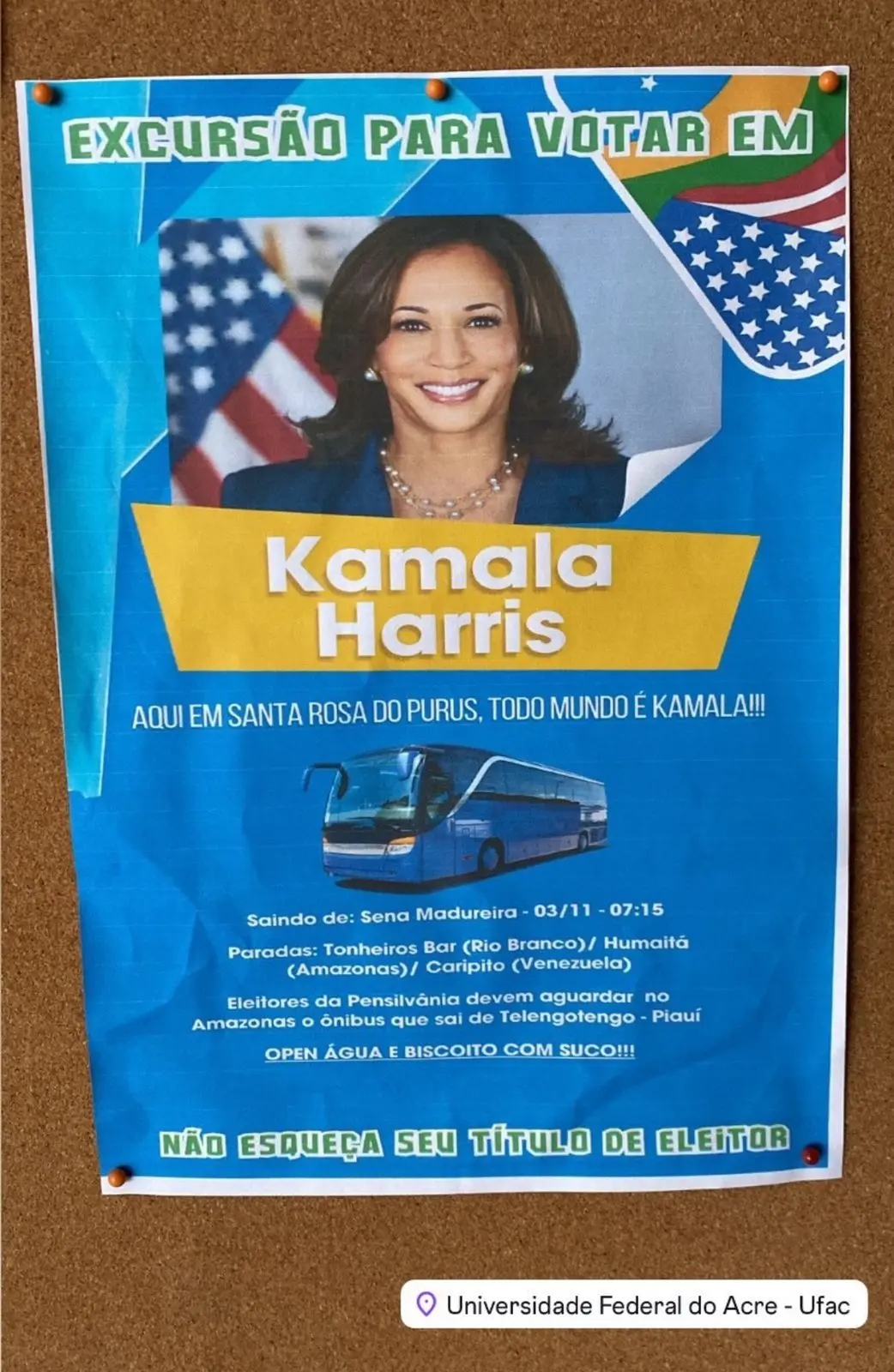 Um cartaz publicado em um mural da Universidade Federal do Acre (Ufac) viralizou nas redes sociais. A brincadeira anuncia uma excursão para quem deseja votar na atual vice-presidente dos Estados Unidos, Kamala Harris, na disputa presidencial deste ano.