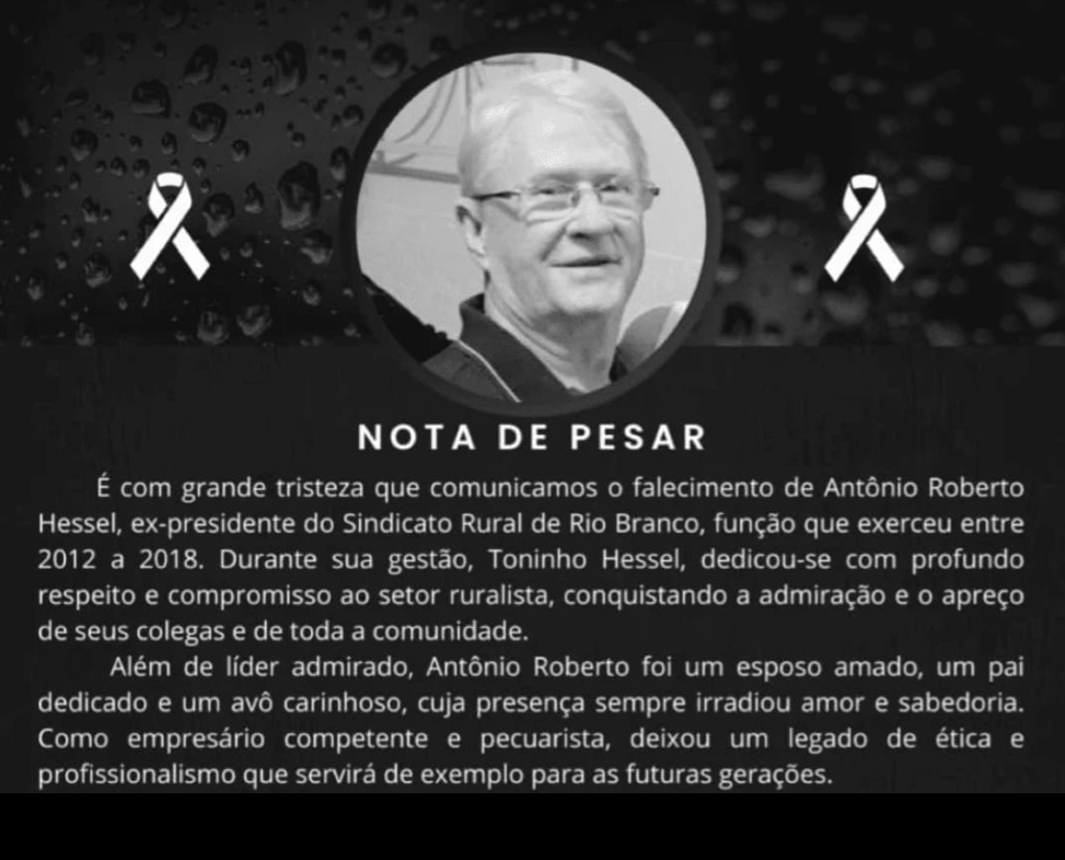Em nota oficial, o Sindicato Rural de Rio Branco destacou a importância de Antônio Roberto para a comunidade e expressou seus sentimentos à família e amigos, ressaltando o impacto positivo que ele deixa como pai, esposo e avô.