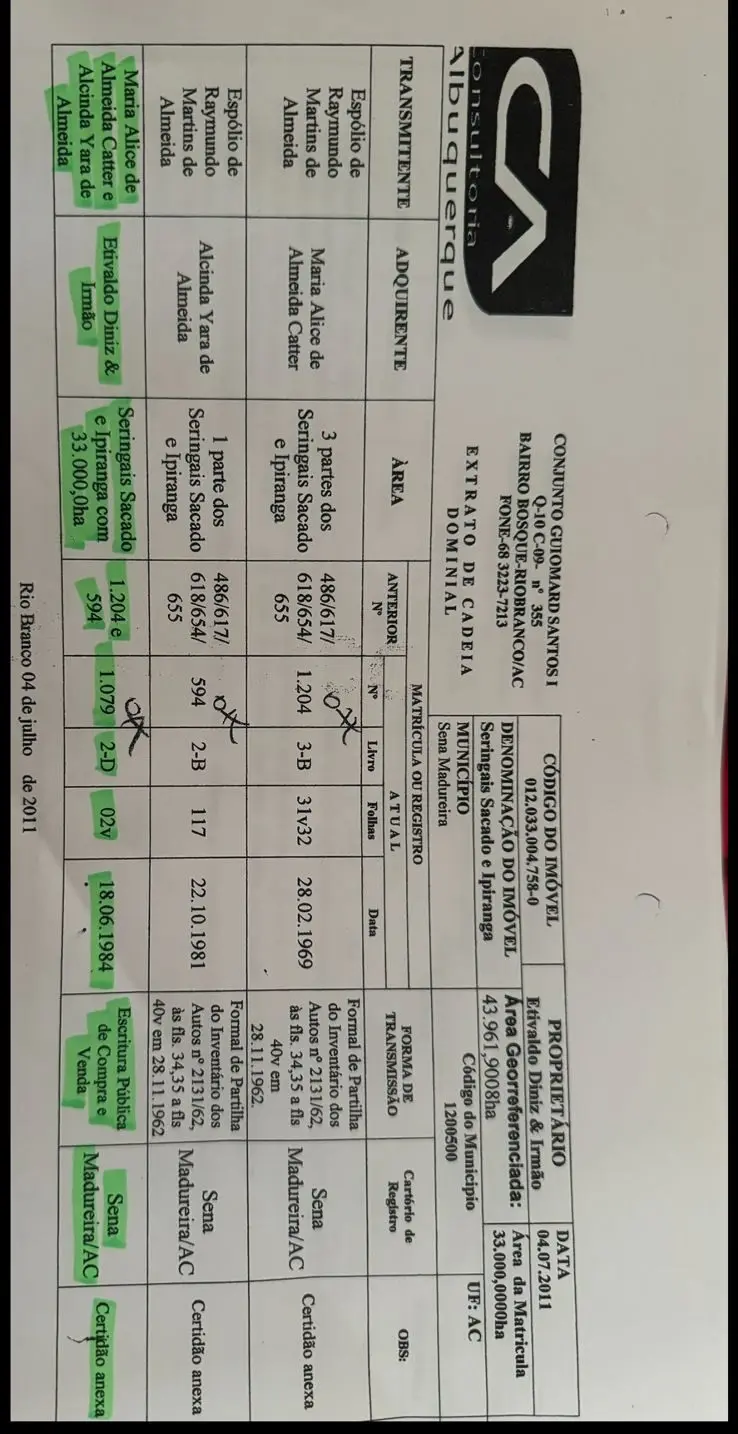 Documento comprova a aquisição do seringal pelos irmãos Etivaldo e Antônio Diniz em 1984/Foto: Reprodução