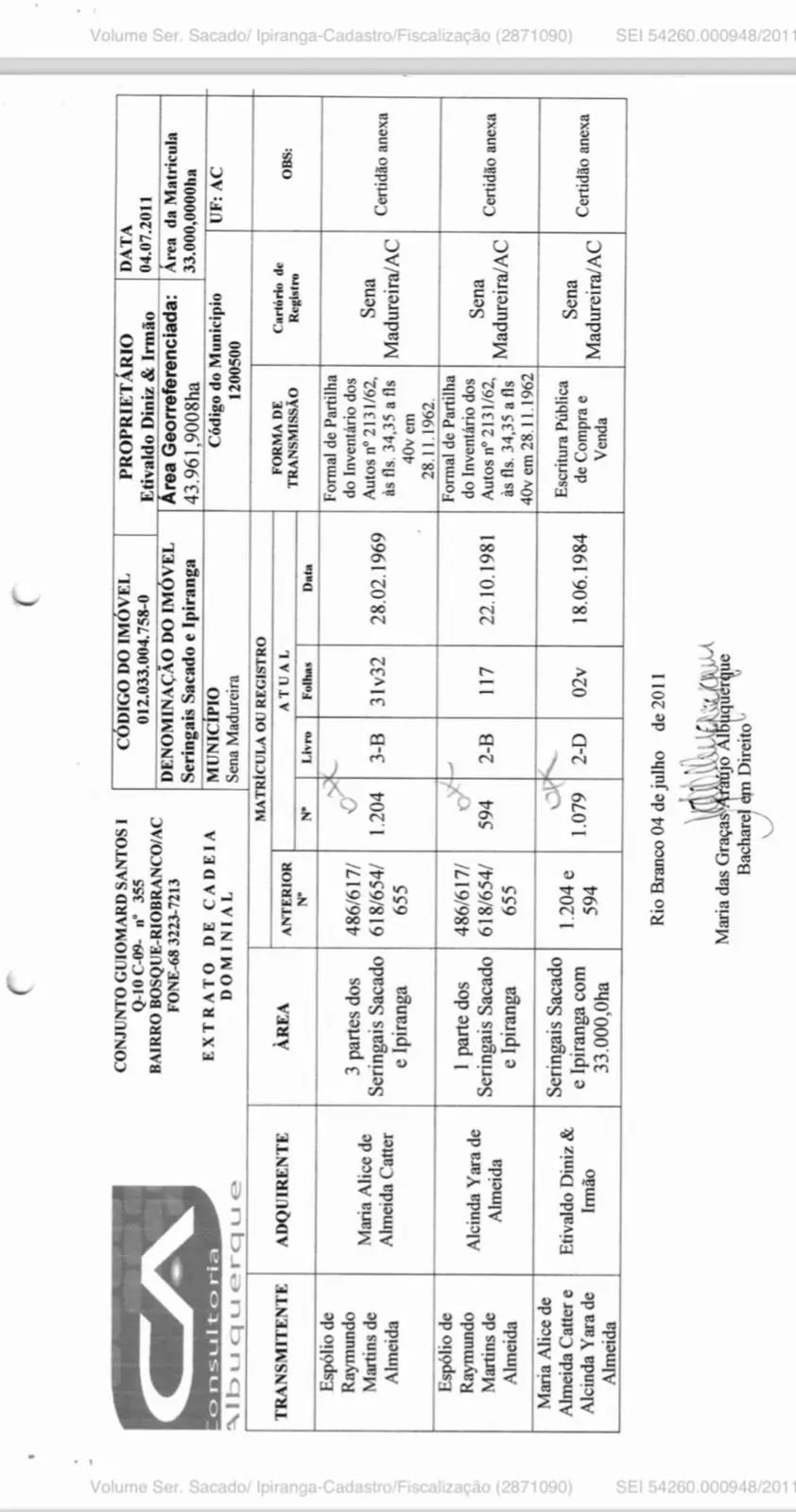 Uma das herdeiras, Izabel Diniz, que fala pela família, mas tem medo de se expor mostrando o rosto por conta da reação dos invasores, explicou que os seringais foram comprados em 1984 pelos irmãos Etivaldo Ferreira Diniz e Antônio Ferreira Diniz, pai e tio dos herdeiros. Os dois formaram a sociedade denominada Etivaldo Diniz e Irmão, com o CNPJ 04.093.795/0001-80.