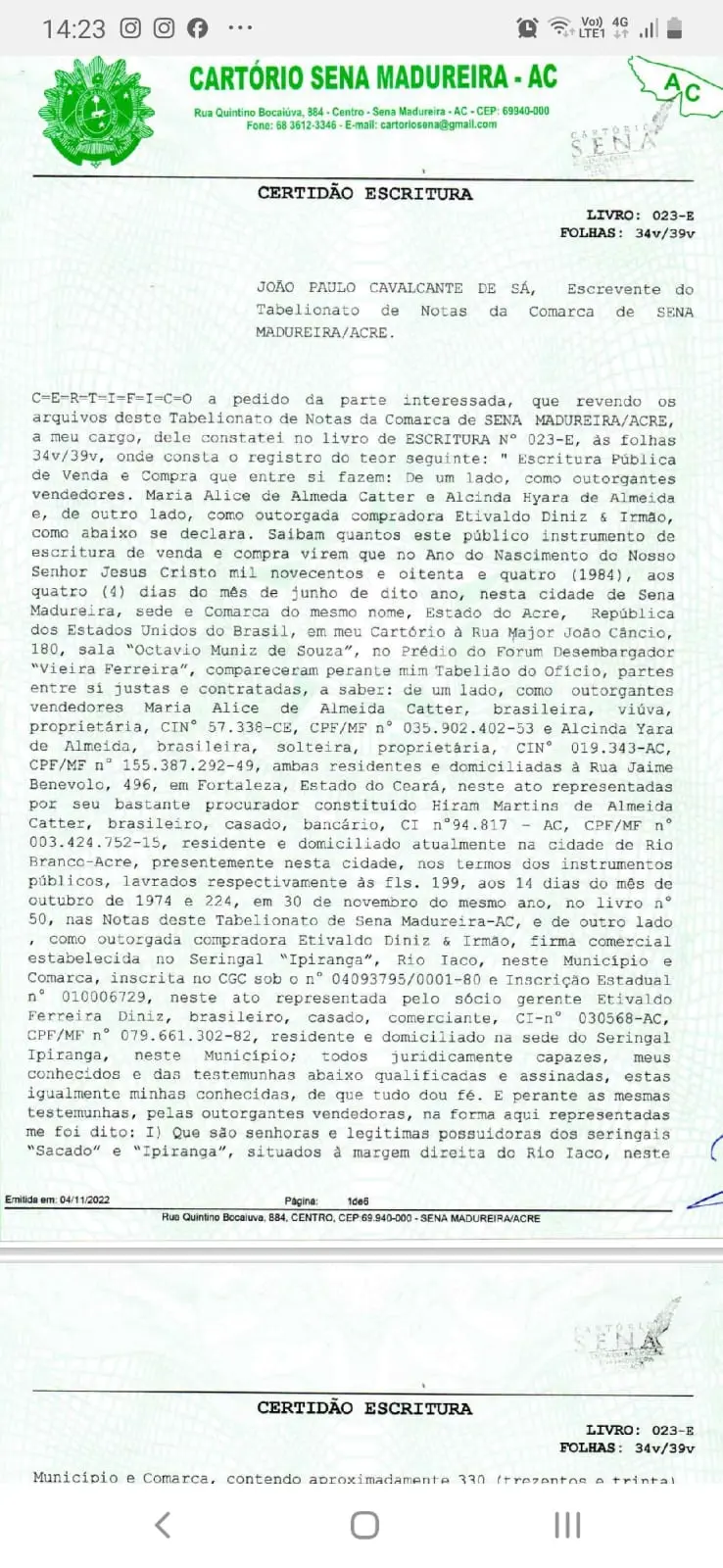 Escritura pública de compra e venda comprova a aquisição do seringal pelos irmãos Etivaldo e Antônio Diniz em 1984/Foto: Reprodução