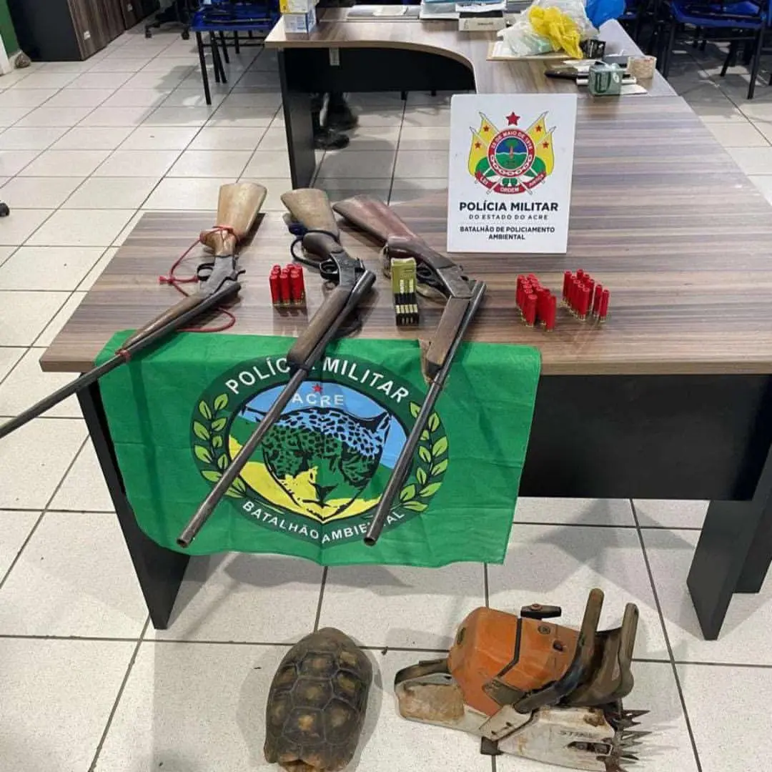 “No dia 24 de outubro, a Polícia Militar, por intermédio do Batalhão de Policiamento Ambiental (BPA), diligenciou no endereço indicado e efetuou a prisão em flagrante de 4 (quatro) pessoas suspeitas de integrar o grupo de invasores, apreendeu 3 (três) armas de fogo, 56 (cinquenta e seis) munições, 1 (uma) motosserra e 1 (um) animal silvestre. Os suspeitos foram conduzidos à Delegacia de Polícia Civil de Sena Madureira, local onde foram entregues o material e o animal apreendidos”, diz a nota.