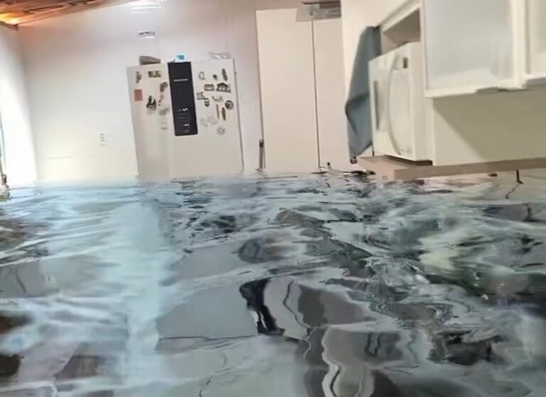 “Hoje eu não vou poder trabalhar, infelizmente, porque eu esqueci a janela aberta. Entrou água por toda casa. Na sala, aqui, ó… Onde eu faço minhas atividades pro trabalho. Na cozinha… Vou só mostrar aqui pro senhor mais ou menos até onde a água foi”, brinca o autor do registro, como se estivesse enviando o vídeo ao seu chefe.