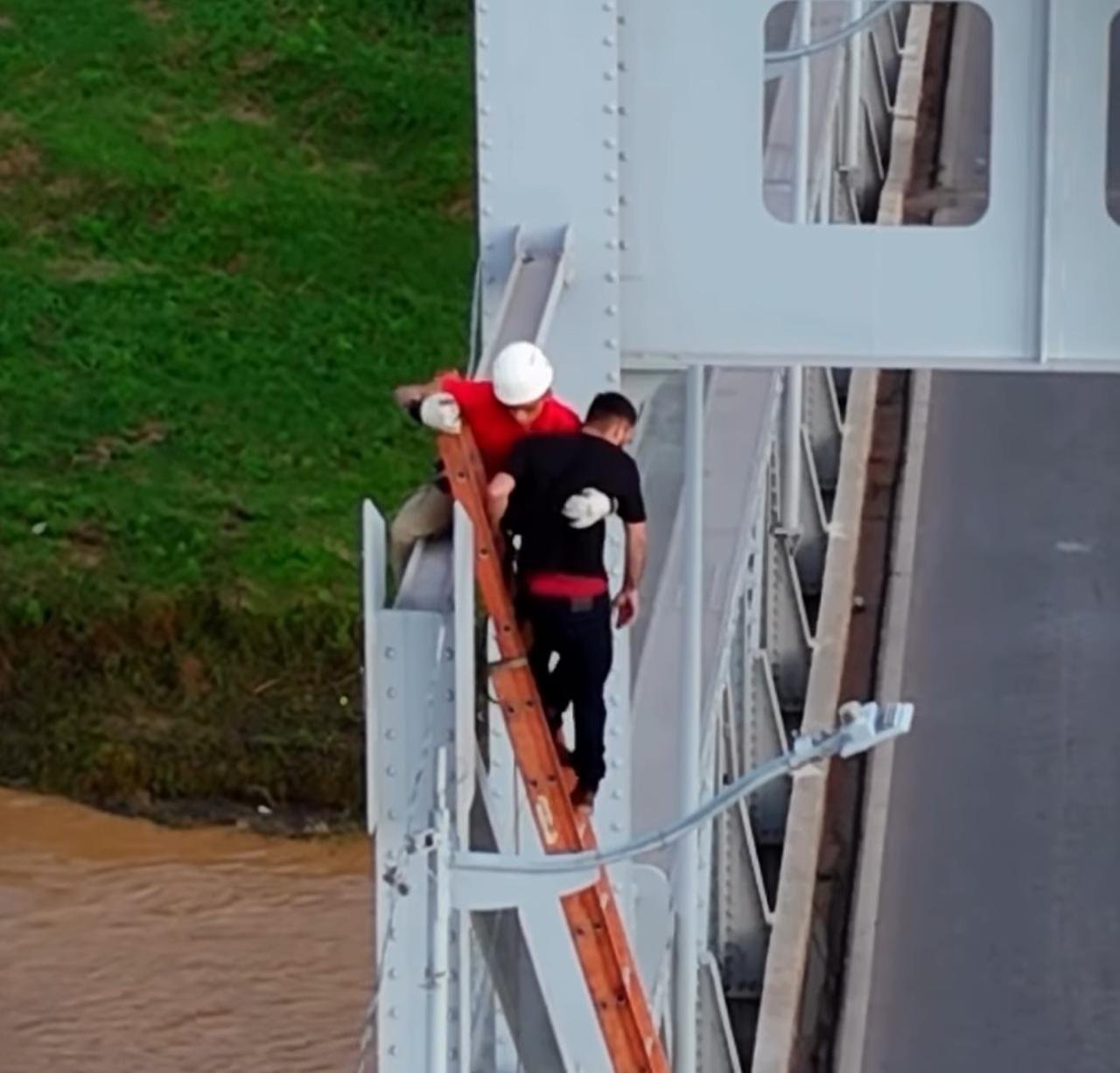 Um vídeo publicado pelo perfil redimagensaereas mostra o momento em que bombeiros resgatam um empresário que tentou se jogar da ponte Juscelino Kubitschek, em Rio Branco (AC), na tarde deste domingo (24). O homem, que estava vestido de preto, passou cerca de duas horas em cima das grades da ponte, em uma situação de desespero.