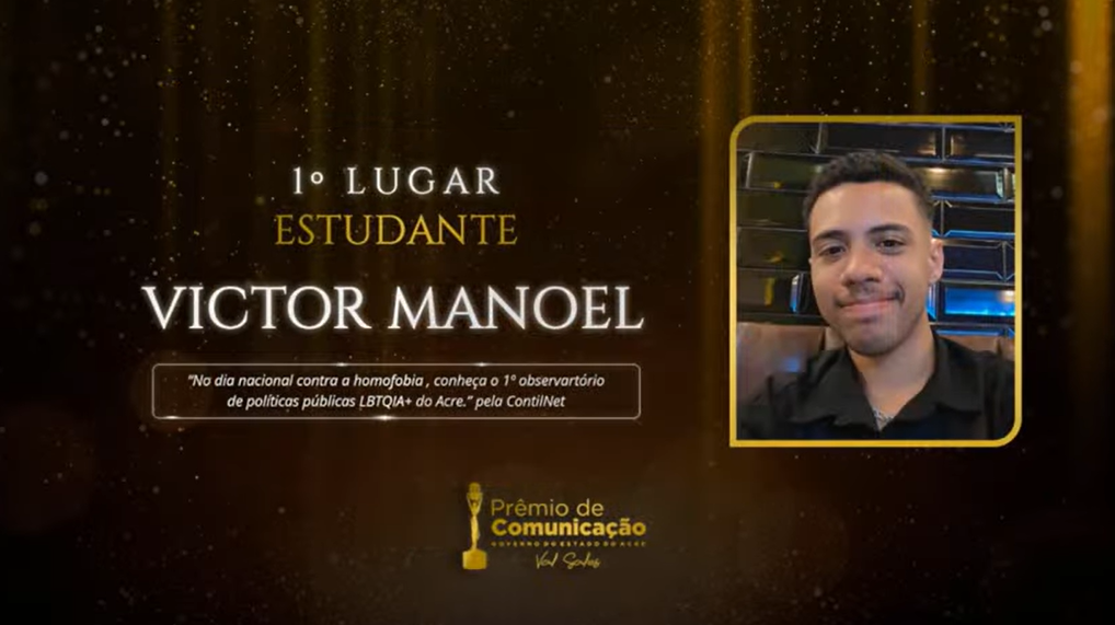 Victor levou o prêmio com a matéria intitulada “No dia nacional contra a homofobia, conheça o 1º Observatório de Políticas Públicas LGBTQIA+ do Acre”, um trabalho que destaca a criação do Observatório como um marco na luta pelos direitos da população LGBTQIA+ no estado.