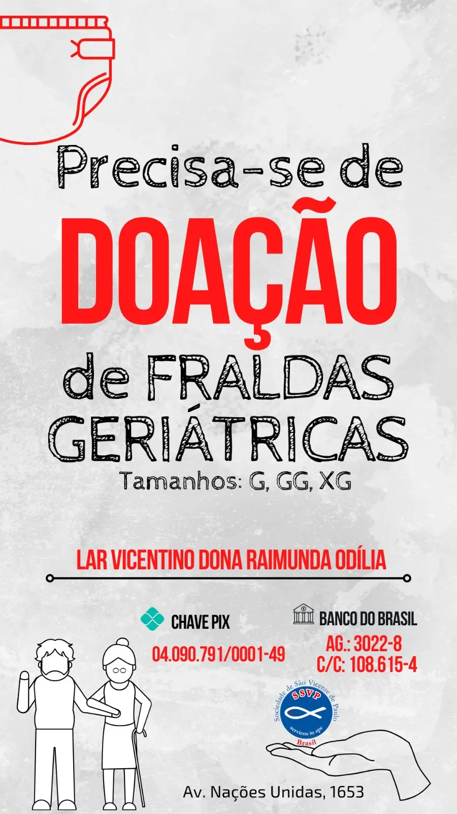 O Lar Vicentino, que atualmente abriga 41 idosos em Rio Branco, lançou uma campanha de arrecadação de fraldas geriátricas, essenciais para a higiene e bem-estar dos residentes. Dos idosos acolhidos, 29 utilizam fraldas de tamanhos G, GG e Extra G, com trocas realizadas a cada três horas, totalizando oito fraldas por dia.