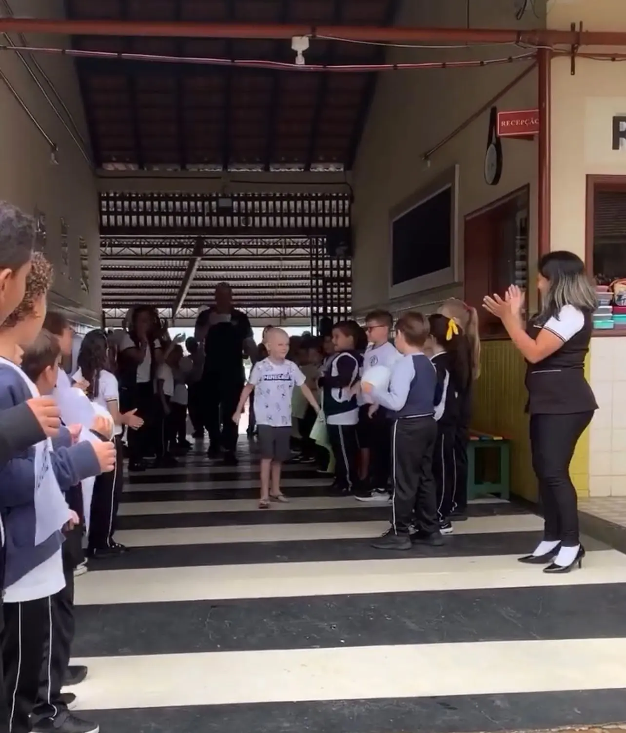 Colegas, professores e funcionários do colégio prepararam uma grande festa, com cartazes, aplausos e demonstrações de carinho.