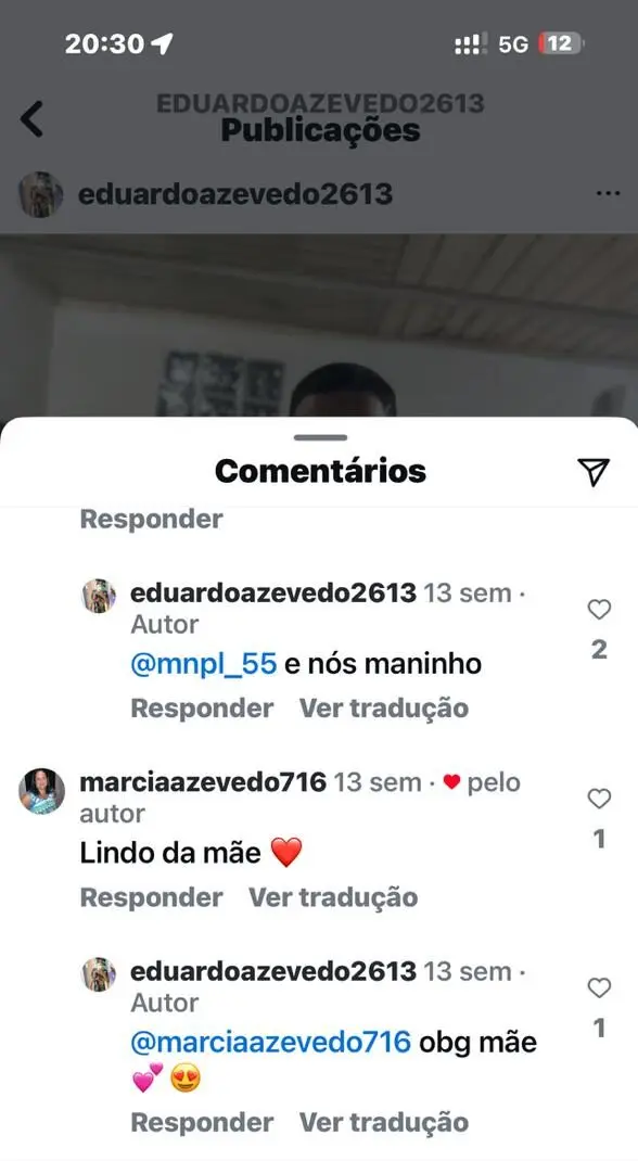 Na foto, a mãe de Eduardo deixa um comentário e reafirma o amor pelo filho.