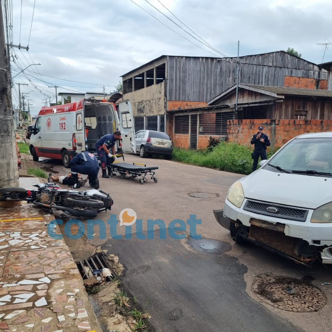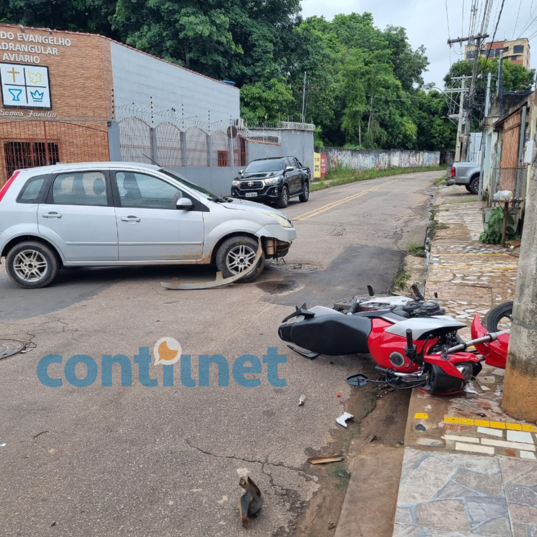 Um acidente envolvendo um carro e uma moto aconteceu no bairro do Aviário, nesta quinta-feira (07).