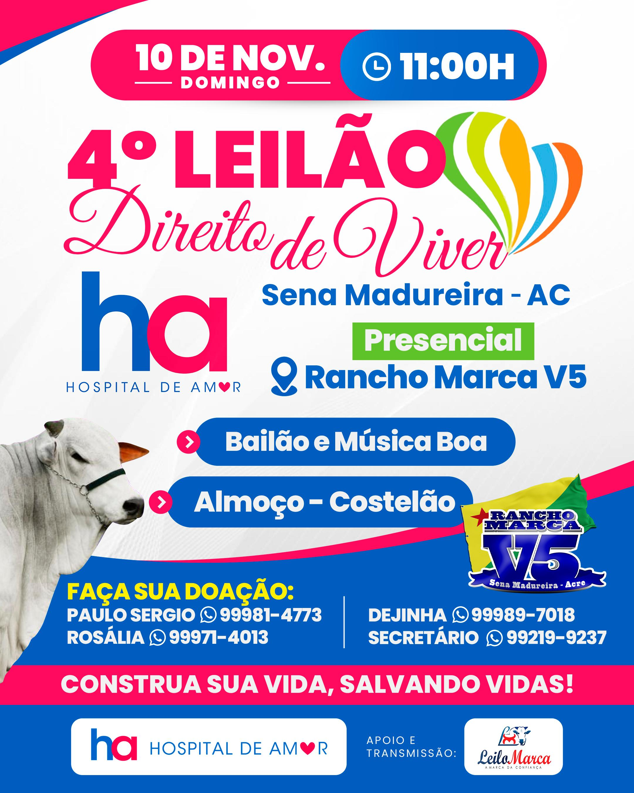 O rancho Marca V5 Agropecuária, localizado na estrada Mário Lobão (Segundo Distrito de Sena Madureira), será palco mais uma vez de um grande evento. Trata-se do leilão “Direito de viver”, que visa arrecadar recursos para o Hospital de Amor que trata pessoas acometidas pelo câncer. O leilão ocorrerá neste domingo (10) a partir das 11 horas da manhã.