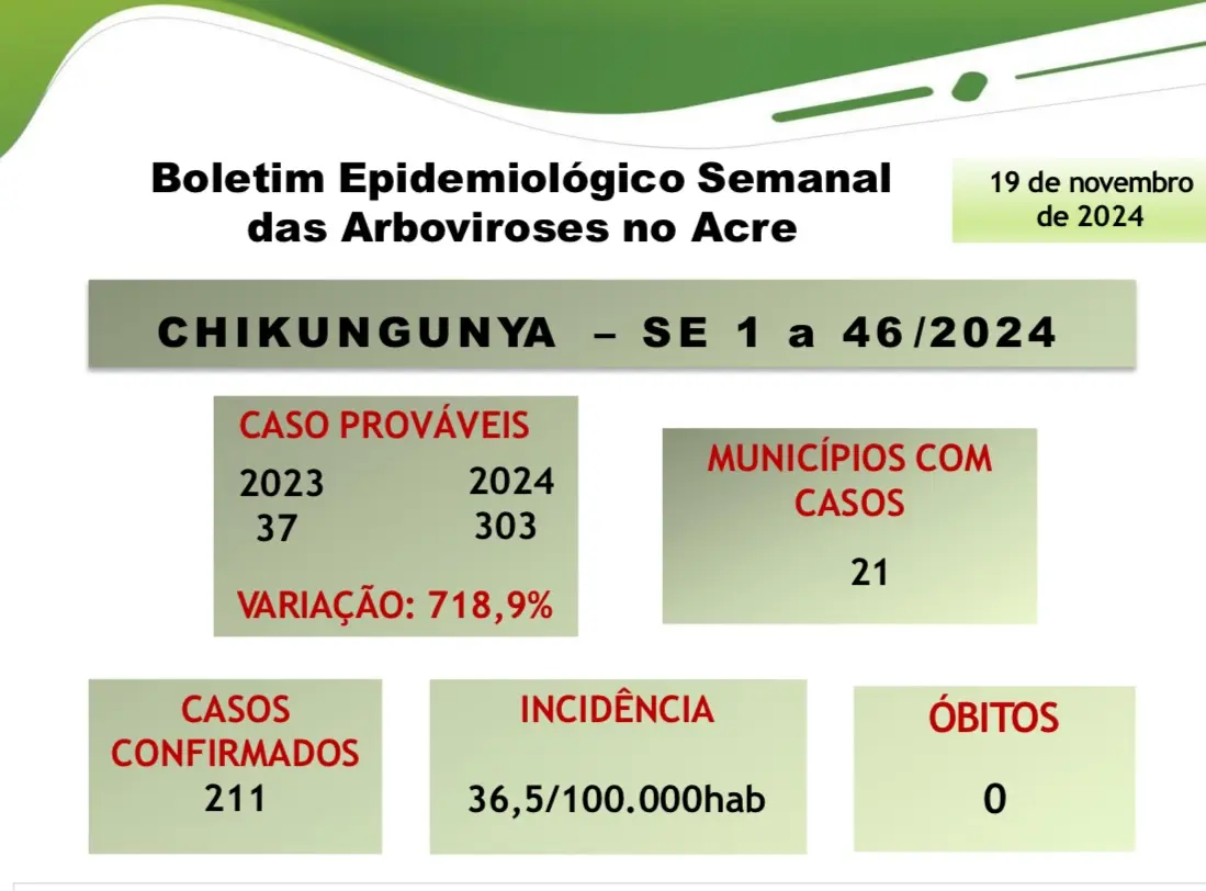 O boletim ainda confirmou que dos 22 municípios do Acre, apenas dois não registraram casos de chikungunya até o momento.