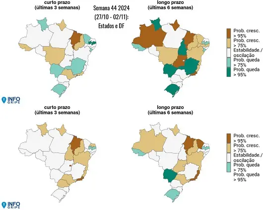 A atualização mostra também que 11 das 27 unidades federativas, até a SE 44, sinalizam crescimento de SRAG na tendência de longo prazo (últimas seis semanas): Amazonas, Amapá, Bahia, Ceará, Espírito Santo, Goiás, Maranhão, Mato Grosso, Pernambuco, Piauí e Rio de Janeiro. Entre as capitais, dez apresentam aumento de casos de SRAG – Goiânia, Macapá, Manaus, Salvador, São Luís, São Paulo, Rio de Janeiro Teresina e Vitória. O Acre não aparece nesta lista.