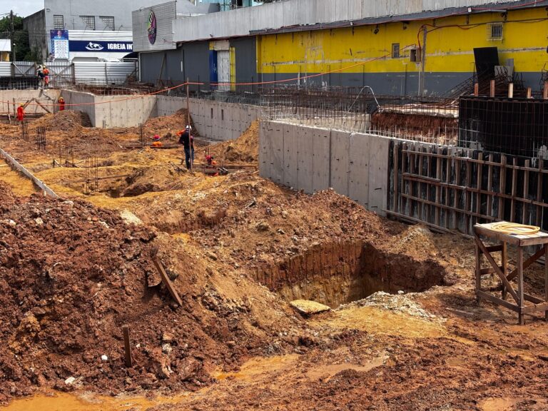 A construção do novo Mercado Elias Mansour, em Rio Branco, segue em ritmo intenso. De acordo com um dos engenheiros responsáveis pela obra, Matheus Oggioni, nesta sexta-feira (08), o projeto está atualmente na fase de contenção e fundação, com três quartos das paredes de contenção concretadas e 40 sapatas já finalizadas.
