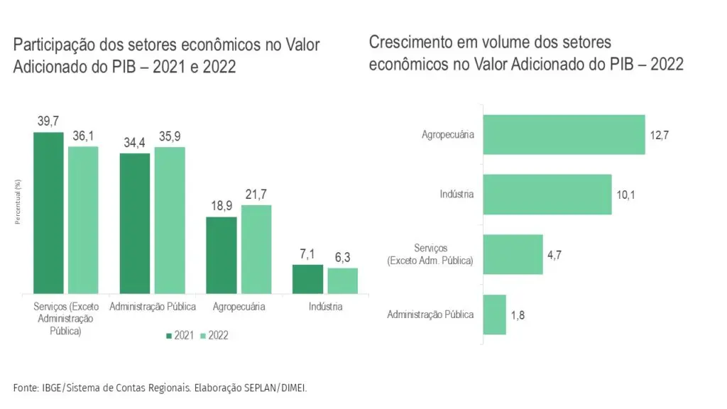 Os demais setores também registraram crescimento em volume, embora tenham perdido participação relativa no PIB do estado, devido ao forte avanço da agropecuária. A indústria, por exemplo, apresentou crescimento de 10,1% em termos de volume, mas sua participação no valor adicionado caiu de 7,1% em 2021 para 6,3% em 2022.