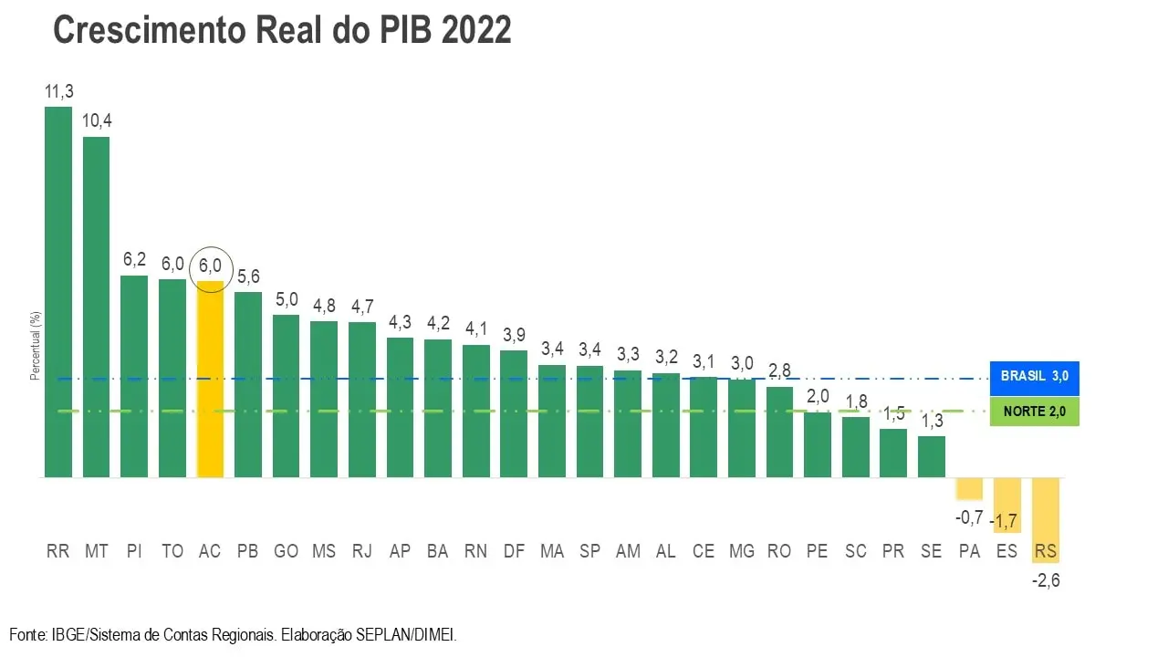Neste sentido, em o PIB acreano alcançou R$ 23,6 bilhões, registrando um crescimento de 6,0% em relação ao ano anterior. O avanço representou o quinto maior crescimento real do PIB entre os estados brasileiros, sendo duas vezes o crescimento do Brasil (3%) e três vezes o da Região Norte (2%). No PIB per capita, o estado saiu de R$ 23.569 em 2021 para R$ 28.525 em 2022. O Acre está atrás apenas – na ordem – de Tocantins, Roraima e bem à frente de estados como Goiás, Minas Gerais, Rio de Janeiro e demais estados.