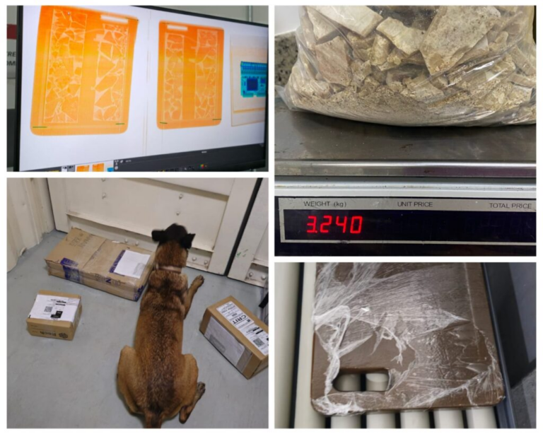 No mesmo dia, o NOC realizou mais uma operação de impacto, desta vez em uma transportadora. Durante a inspeção, um carregamento suspeito chamou a atenção dos investigadores. Com o auxílio de cães farejadores, especializados na detecção de entorpecentes, foi possível localizar a droga escondida em um local engenhoso, dentro de madeiras utilizadas para armazenar tábuas de carne. A ação resultou na apreensão de 3,2 kg de pasta base de cocaína.
