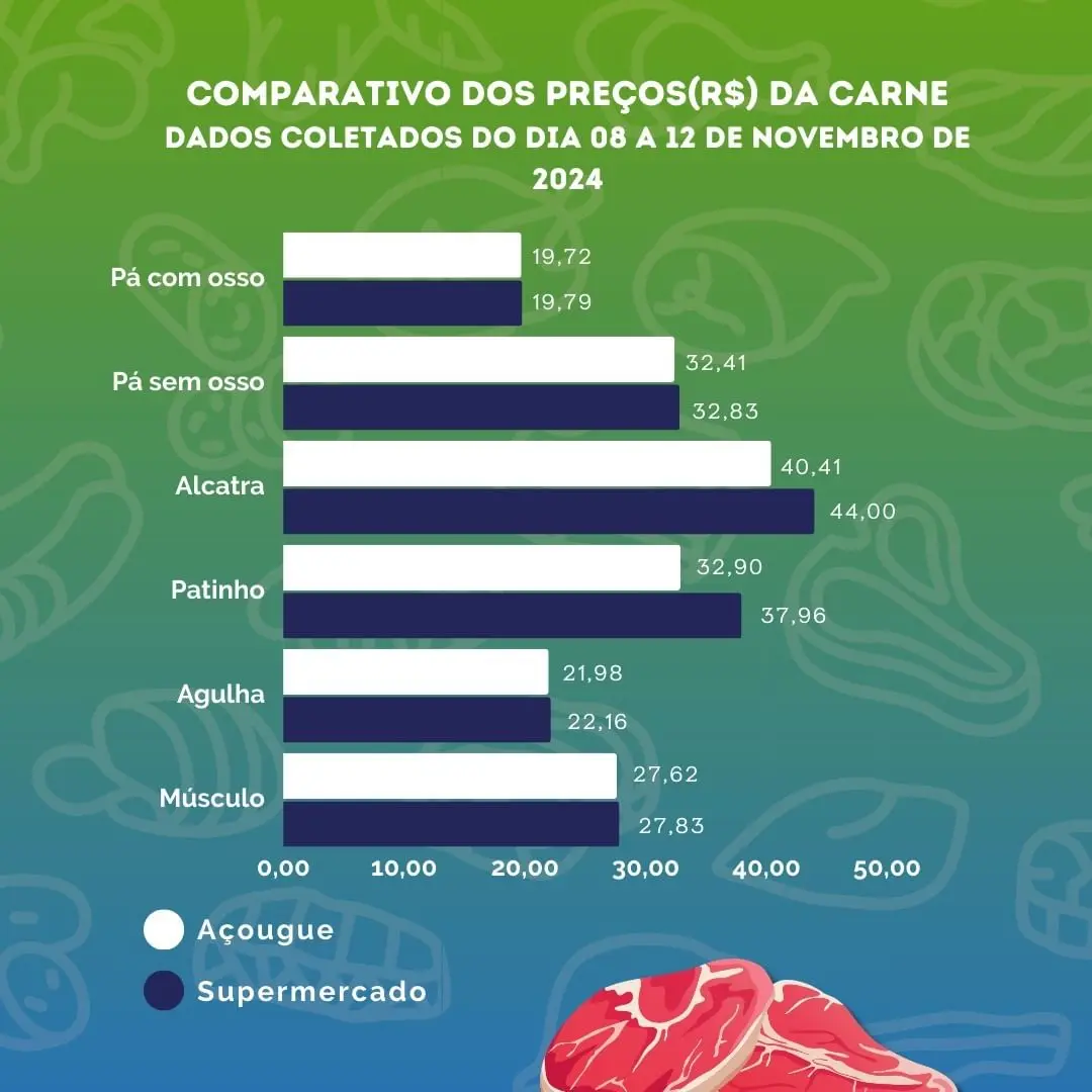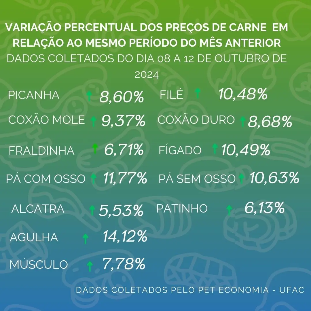 O Programa de Educação Tutoria do curso de economia da Universidade Federal do Acre divulgou no último dia 15 de novembro, o levantamento dos preços de carne bovina na cidade de Rio Branco. Este é o segundo mês do consecutivo que o programa mostra crescimento do preço em todos cortes.