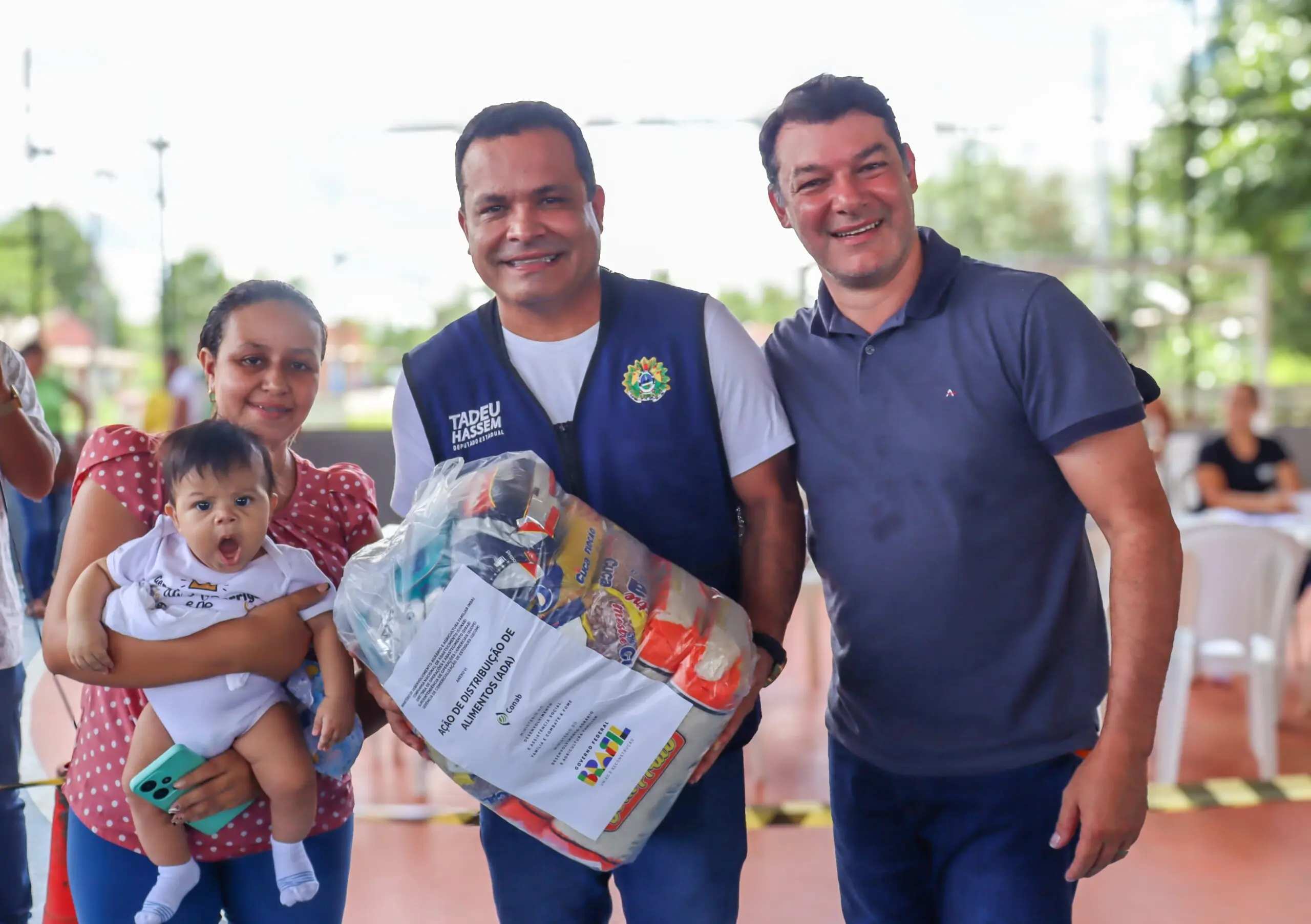 Deputado Estadual Tadeu Hassem e Deputado Federal Roberto Duarte participam da entrega das cestas básicas para moradores de Brasiléia/Foto: Ascom