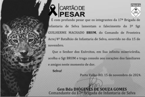 O comandante deixou o seu pesar pela morte do militar acreano em nota publicada. “Que o Senhor do Exércitos, em sua infinita misericórdia, acolha o sargento Brum e traga consolo aos corações dos familiares e amigos neste momento de dor”.
