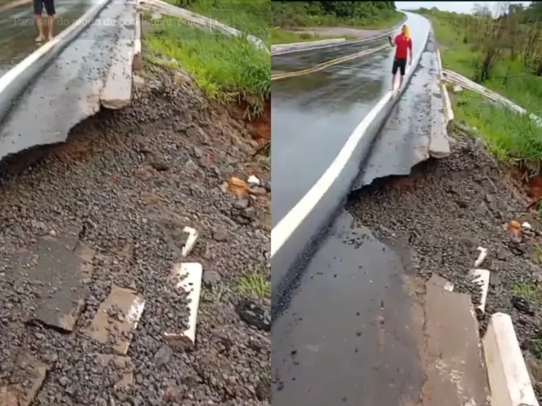 A forte chuva que atingiu a região fez com que parte do asfalto cedesse, oferecendo risco aos motoristas.