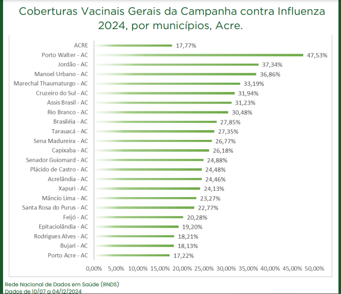 A capital Rio Branco, que tem o maior número de habitantes, registrou apenas 30,48% de cobertura. No final da lista, Porto Acre, com 17,22%, apresentou o menor índice de cobertura entre todos os municípios.