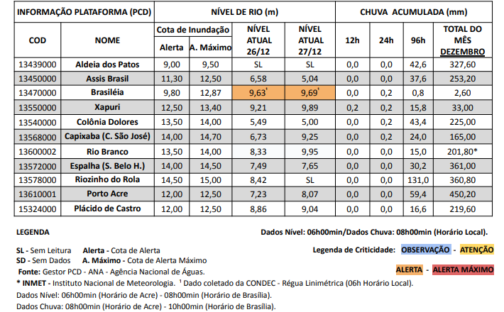 Em Brasileia, o Rio Acre atingiu a Cota de Alerta na última quinta-feira (27), e de acordo com a medição desta sexta continua subindo, alcançando a marca de 9,69 metros por volta das 6h da manhã.