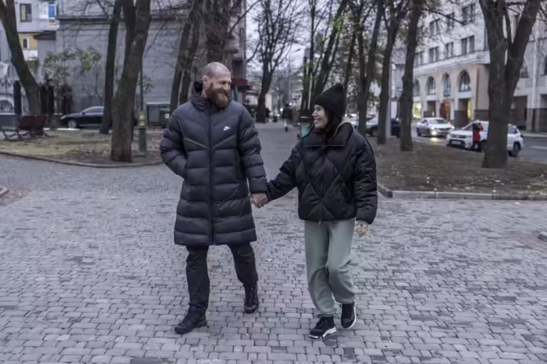 Quando a dubladora Yulia Hrabovska, de 35 anos, visita o marido, Volodymyr Hrabovsky, eles costumam ficar dentro de casa e tentam ter uma vida acolhedora, deitados na cama ou assistindo a filmes juntos. Por vezes ela prepara as panquecas de banana preferidas dele, e ambos tentam imaginar que, nesses dias, não há guerra. Os dois iniciaram o relacionamento nos primeiros meses do conflito, e ela estava grávida de quatro meses quando ele foi para a linha de frente, um período que ela só consegue lembrar como sendo “dias muito difíceis”.