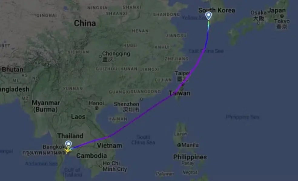 Trajeto do voo Jeju Air 2216, de Bangkok para Muan, na Coreia do Sul — Foto: Reprodução/FlightRadar24