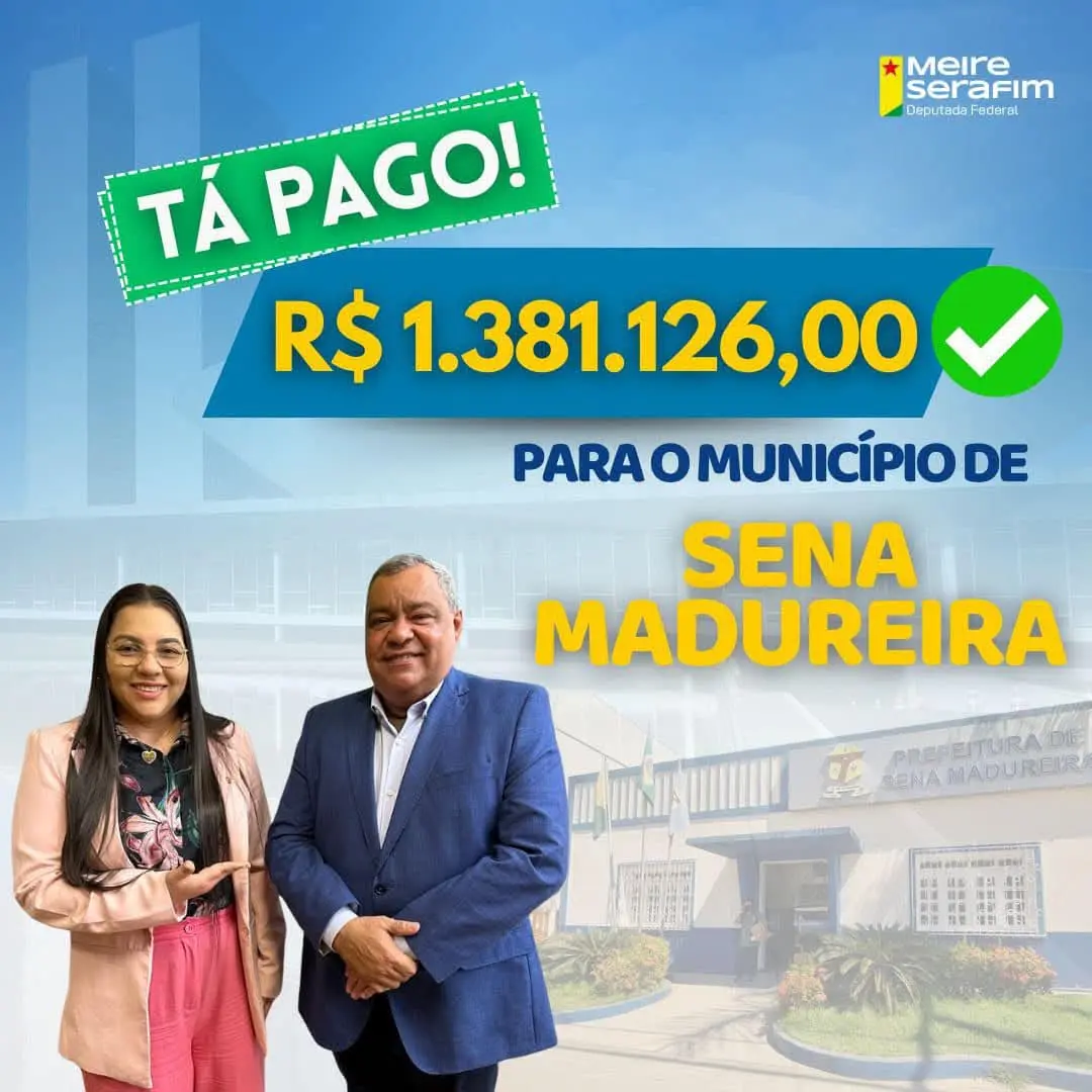 A Deputada Federal Meire Serafim (UB-AC), representante de Sena Madureira, anunciou a liberação de R$ 9,1 milhões em recursos para diversos municípios do Acre. O anúncio foi feito em suas redes sociais e inclui investimentos destinados a áreas como infraestrutura, saúde, educação e cultura.