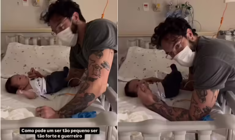 “Olha como ele tá forte, tá lindo. Nem parece que passou o que passou, de tão forte, esperto. Papai te ama demais, meu filho”, derrete-se ele, que acrescentou a legenda: “Como pode um ser tão pequeno ser tão forte e guerreiro.”