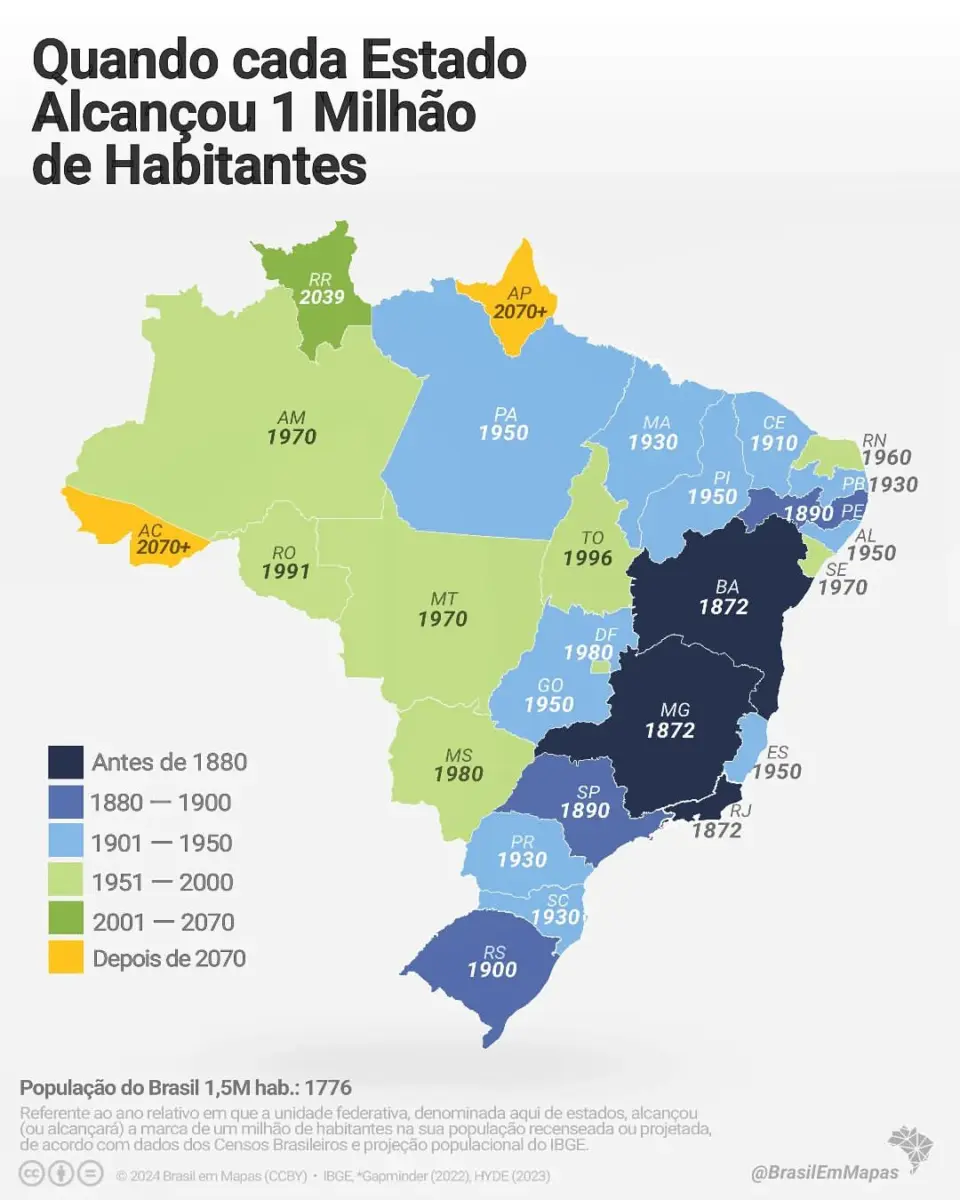 O levantamento também fez análise de dados de censos antigos do Instituto Brasileiro de Geografia e Estatística (IBGE), para registrar os anos em que todas as unidades federativas chegaram à marca de um milhão.