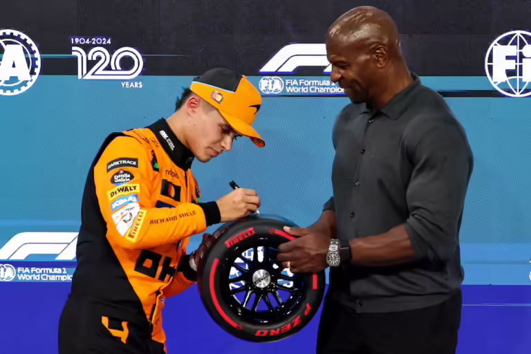 Lando Norris assina pneu entregue por Terry Crews após garantir a pole na Yas Marina.