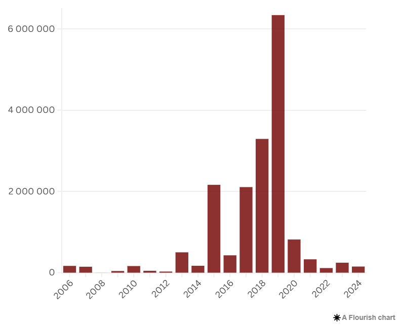 Os dados indicam que as dívidas referentes a pagamentos de benefícios de 2019 foram as maiores, totalizando mais de R$ 6 milhões. Os dois anos anteriores também apresentam débitos relevantes que variam de R$ 2,1 milhões a R$ 3,2 milhões.