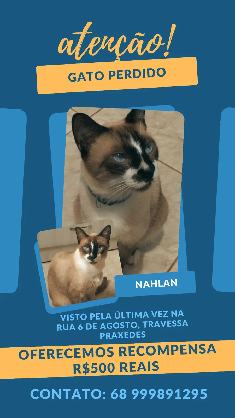 A moradora do bairro 6 de Agosto, Marta Furtado, está em busca de seu gato de estimação, Nálan, que desapareceu nas proximidades da Rua Trav. Praxedes, em Rio Branco. O felino, da raça Siamês, foi visto pela última vez nas redondezas do bairro, e desde então, a dona tem feito um apelo para encontrá-lo.